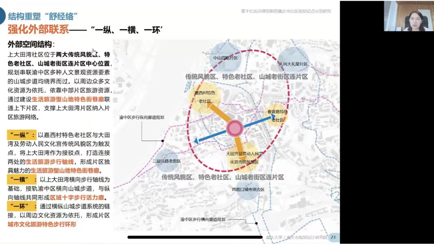 紧接着,重庆大学黄瓴教授向我们介绍了城市更新背景下的城市社区规划,联系城市更新和社区更新的大背景下,进行以人为核心的社区的综合治理规划和设计改造,解决人-空间-服务三者不平衡不充分的矛盾,运用渝中区“十八梯”建设规划的例子让我们直观感受到协调老旧遗存、快速发展珍存、未来繁荣三者的关系至关重要。黄瓴教授强调了社区规划师的价值观,应用因地制宜、以人为本的规划编制来指导社区规划的实施,而社区规划需要着眼于社区近期和远期的发展目标,这样才能够对在社区规划的评估中发现缺失与不足,根据规划后现状情况和居民反馈为再修正环节提供参考,从而不断完善优化社区规划的编制,实现可持续的社区规划全过程。黄教授还向我们介绍了“完整社区”的新概念,指出社区本身是一个社会学概念,而社区规划与建设的出发点是基层居民的切身利益,因此社区不仅包括了物质环境的硬件条件,还包括了管理机制的软件条件,内涵非常丰富。