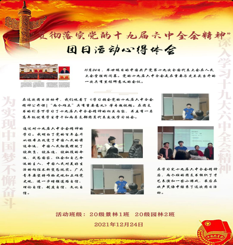 2021级风景园林7、8班在12月25日31教202内通过提前准备小吃食,有奖激励回答,高年级优秀学生骨干分享学习心得,团员交流,制作PPT和精美海报等形式明白了作为中国共产党的第三个历史决议,其集中了全党的智慧,是一篇马克思主义的纲领性文献,是新时代中国共产党人牢记初心使命,坚持和发展中国特色社会主义的政治宣言,是以史为鉴、开创未来,实现中华民族伟大复兴的行动指南。自中国共产党成立以来,就始终把为中国人民谋幸福、为中华民族谋复兴作为自己的初心使命,始终坚持社会主义信念和共产主义理想。