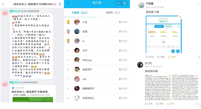 本次“成长合伙人”语言类活动于11月9日正式拉开序幕。活动为期四周,每组成员通过背单词、做真题、练口语等多种形式学习英语或小语种,并采用线上小程序“小小签到”进行打卡记录。各小组长统计、上报本组打卡情况,最后角逐出“最佳合伙人”小组。活动过程中,负责人统筹细致,组员表现优异学习热情始终高昂,展现了良好的学习氛围。活动结束,全勤小组总计28组,经过活动负责人严格公正的审核评比,评出“最佳合伙人”小组。
