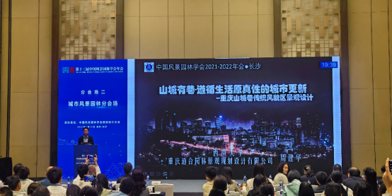 副院长周建华教授在“城市风景园林分会场”发表题为《山城有巷——遵循生活原真性的城市微更新》的主题报告,报告以重庆山城巷为例,深度挖掘山城巷子历史痕迹,沿袭山城市井生活文脉,遵循“小规模·低冲击·精细化”的更新策略,提出“风貌原真的融合、街巷原形的疏通、场所原象的营造、地景原貌的再生、人情原味的共融”等五大街巷更新价值体系,为推动高质量发展时期的山地城市更新提供了重要理论支撑和实践参考。