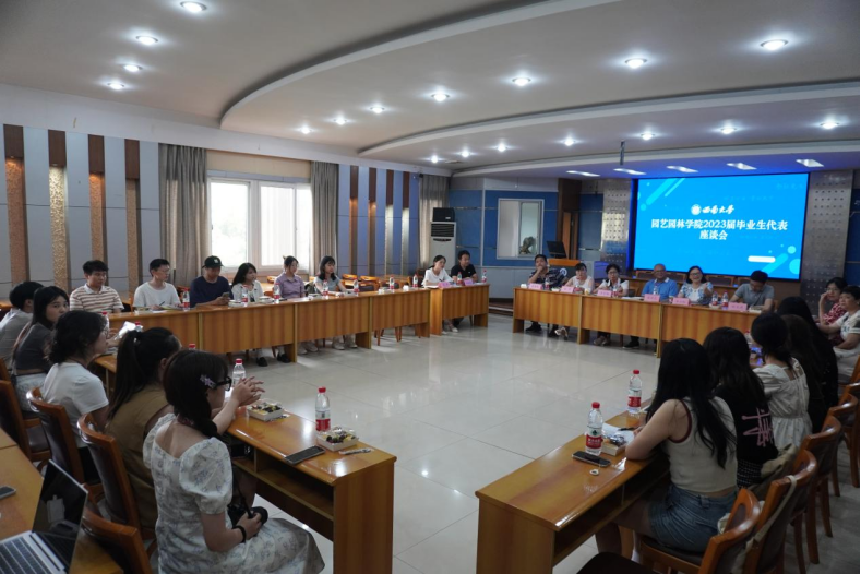 院长宋洪元,副书记李小红,原党委书记李雪梅,园艺系系主任潘宇,风景园林系系主任杜文武,班主任代表夏燕、刘世尧,学工办代表谭泽轩、余容、金云鹤出席座谈会,2023届本硕毕业生代表20人参与座谈。会议由李小红主持。