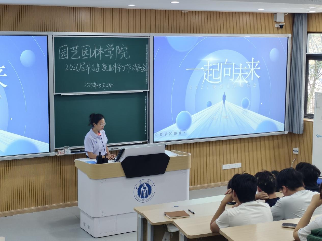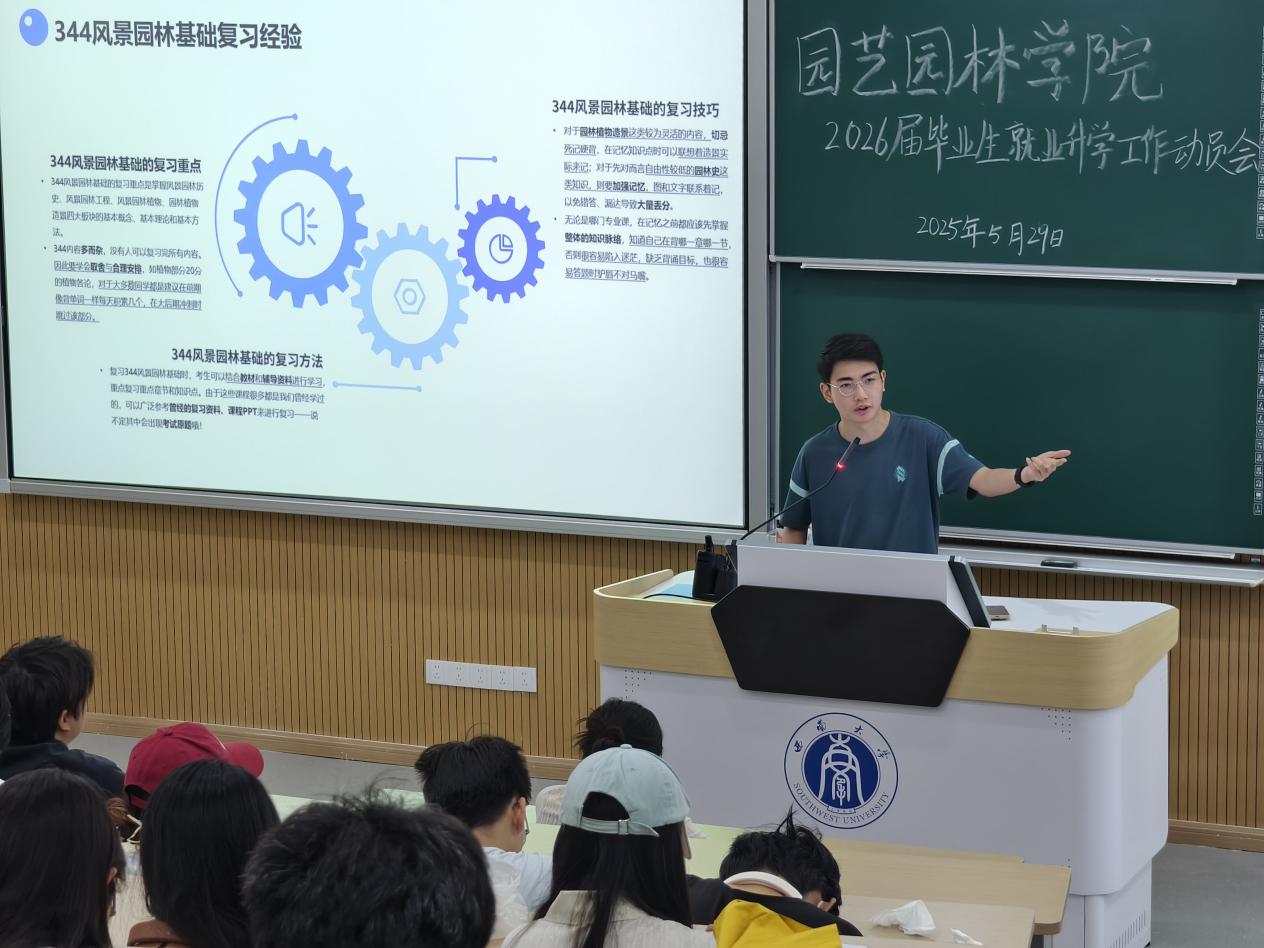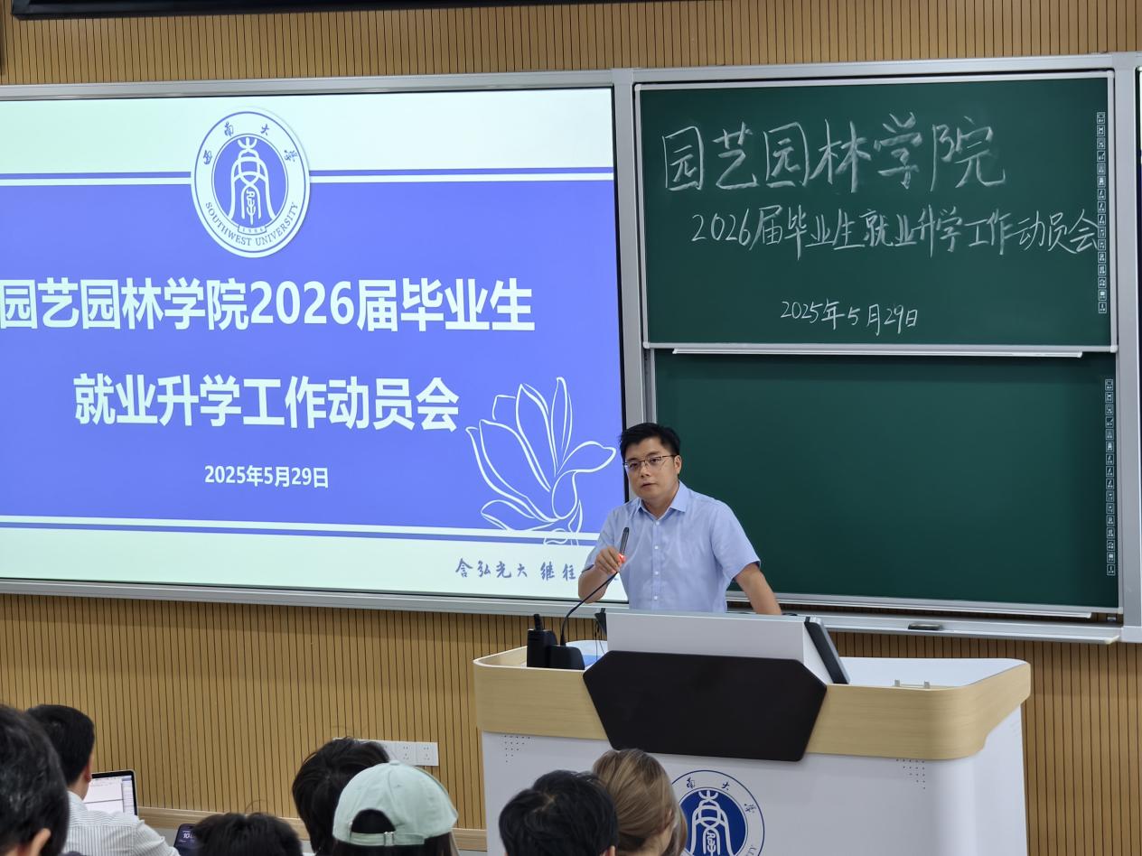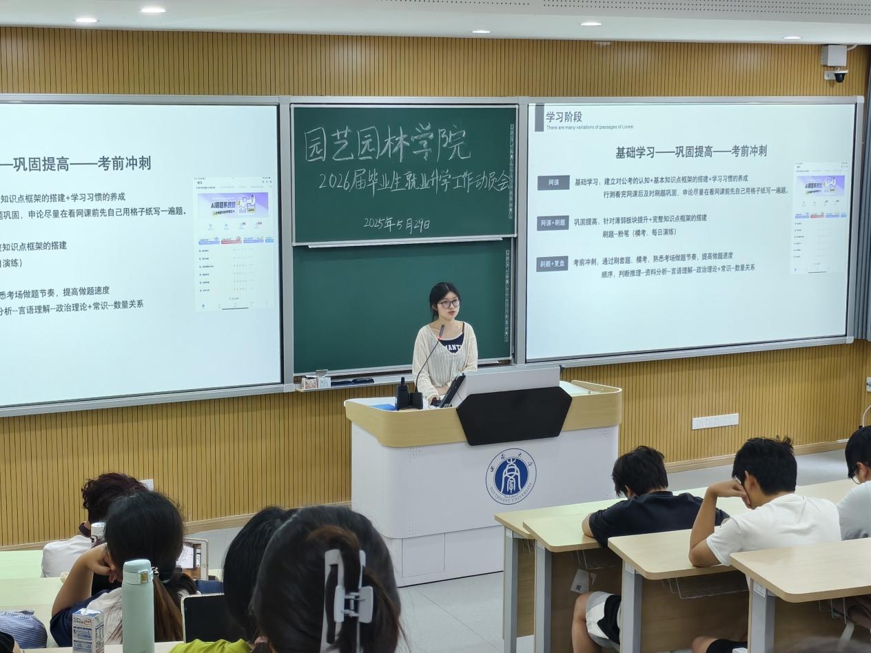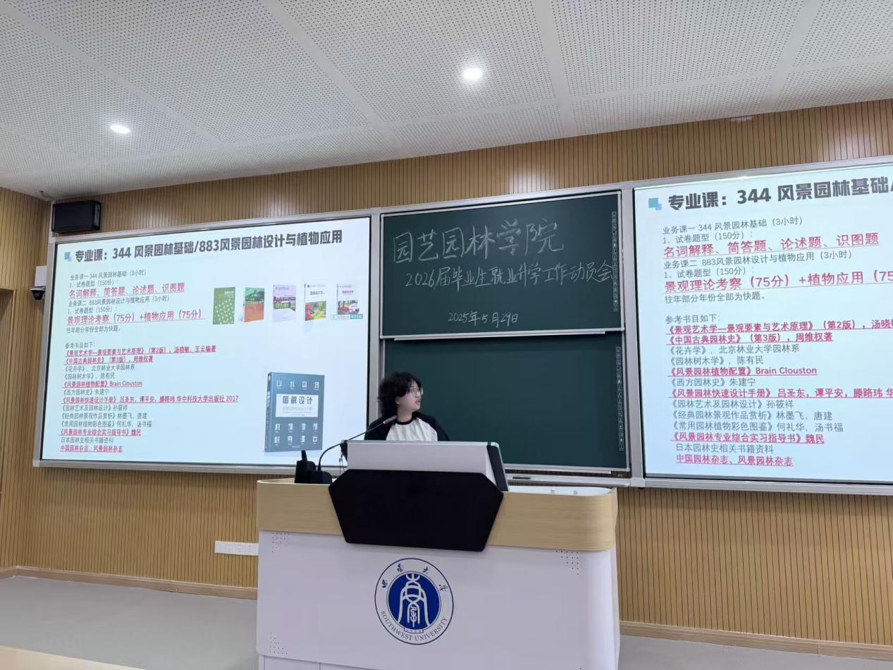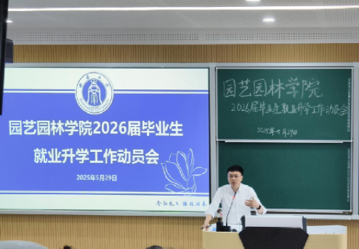 党委副书记、纪委书记王强,风景园林系主任杜文武出席会议,2025届优秀毕业生代表及2026届园林、风景园林专业全体学生参会。会议由2026届毕业生辅导员邓珍珍主持。