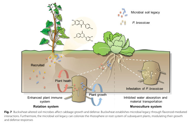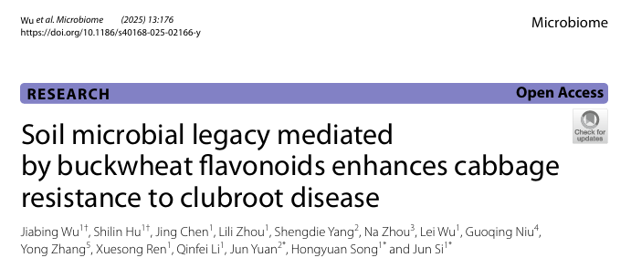 司军教授、宋洪元研究员联合南京农业大学袁军教授团队在国际微生物组权威期刊Microbiome发表了题为Soil microbial legacy mediated by buckwheat flavonoids enhances cabbage resistance to clubroot disease的研究论文。该研究系统阐明了荞麦通过分泌特定黄酮类物质,重塑土壤微生物群落,并增强后茬甘蓝对根肿病抗性的机制,为构建精准化的绿色轮作模式提供了理论依据和实践路径。