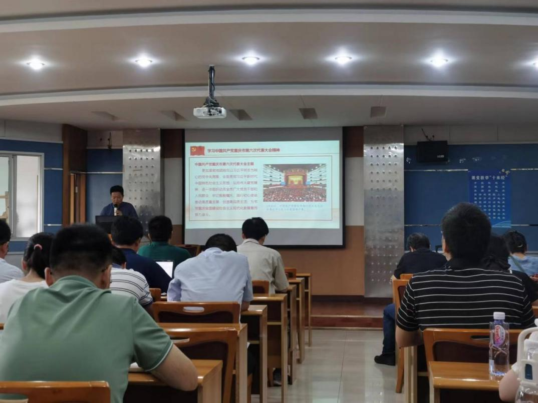周建华副院长领学了中国共产党重庆市第六次代表大会精神。大会指出,书写重庆全面建设社会主义现代化新篇章,必须突出抓好三项重大任务、努力实现六方面目标、落实十一项重点举措。推动推动各项事业发展,关键在党,关键在人,要落实全面从严治党主体责任和监督责任,推进党的政治建设、思想建设、组织建设、作风建设和纪律建设,以高质量党建引领保障高质量发展。周院长强调,全院教职工要切实把思想和行动统一到重庆市第六次党代会精神上来,踏踏实实干事创业,推动教学和科研工作取得新发展,以优异的成绩来迎接党的二十大胜利召开。