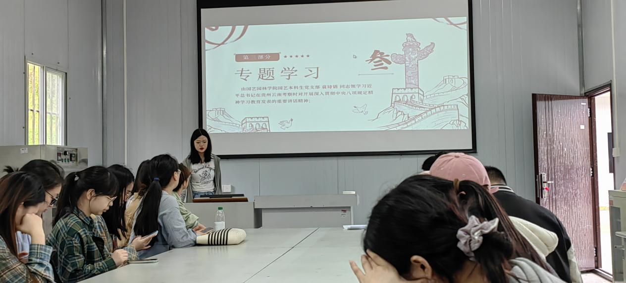园艺本科生党支部袁诗语领学习近平总书记在贵州和云南考察时的重要讲话精神,赵茂伶领学习近平总书记关于加强党的作风建设的重要论述和中央八项规定及其实施细则精神。