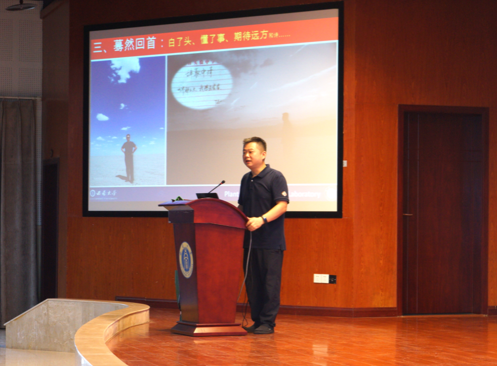 胡春梅学姐鼓励同学们树立宏远的目标,寻找自己的热爱,无惧未知冲破黑暗,塑造光明的未来。关注自己的专业学习、价值塑造和能力培养。头顶云天,脚踩大地,胸怀壮志,放眼未来。
