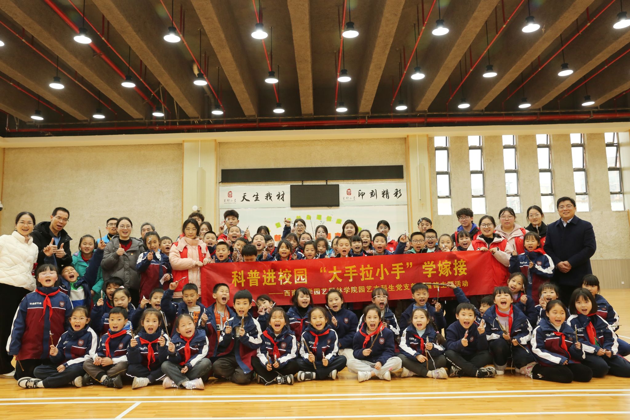 党委副书记王强、园艺本科生党支部书记邓珍珍带领园艺本科生党支部的志愿者们走进北碚区天印小学,开展了以“学雷锋科普进校园,‘大手拉小手’学嫁接”为主题的科技志愿服务活动。