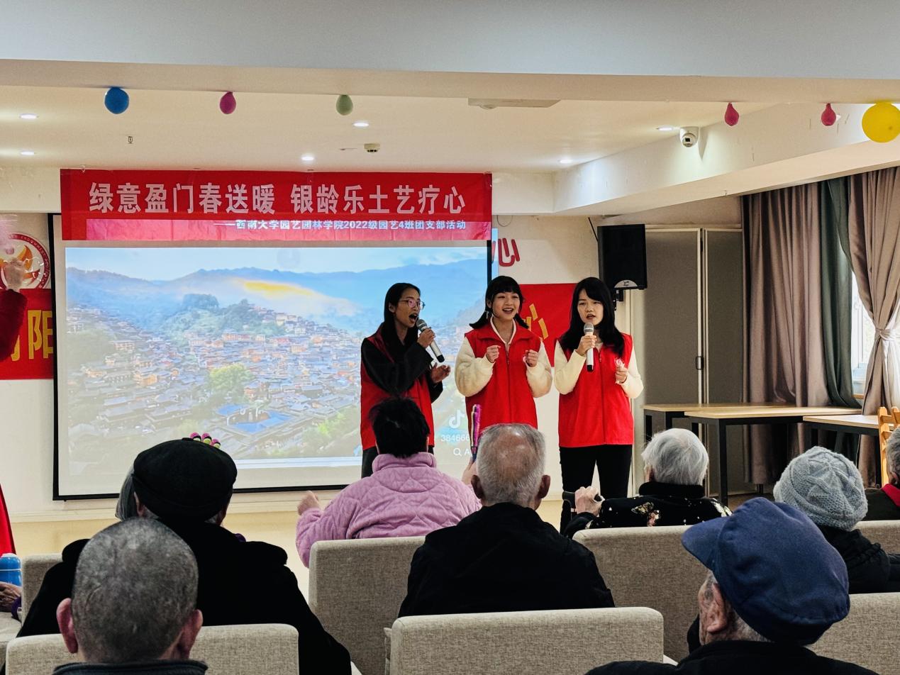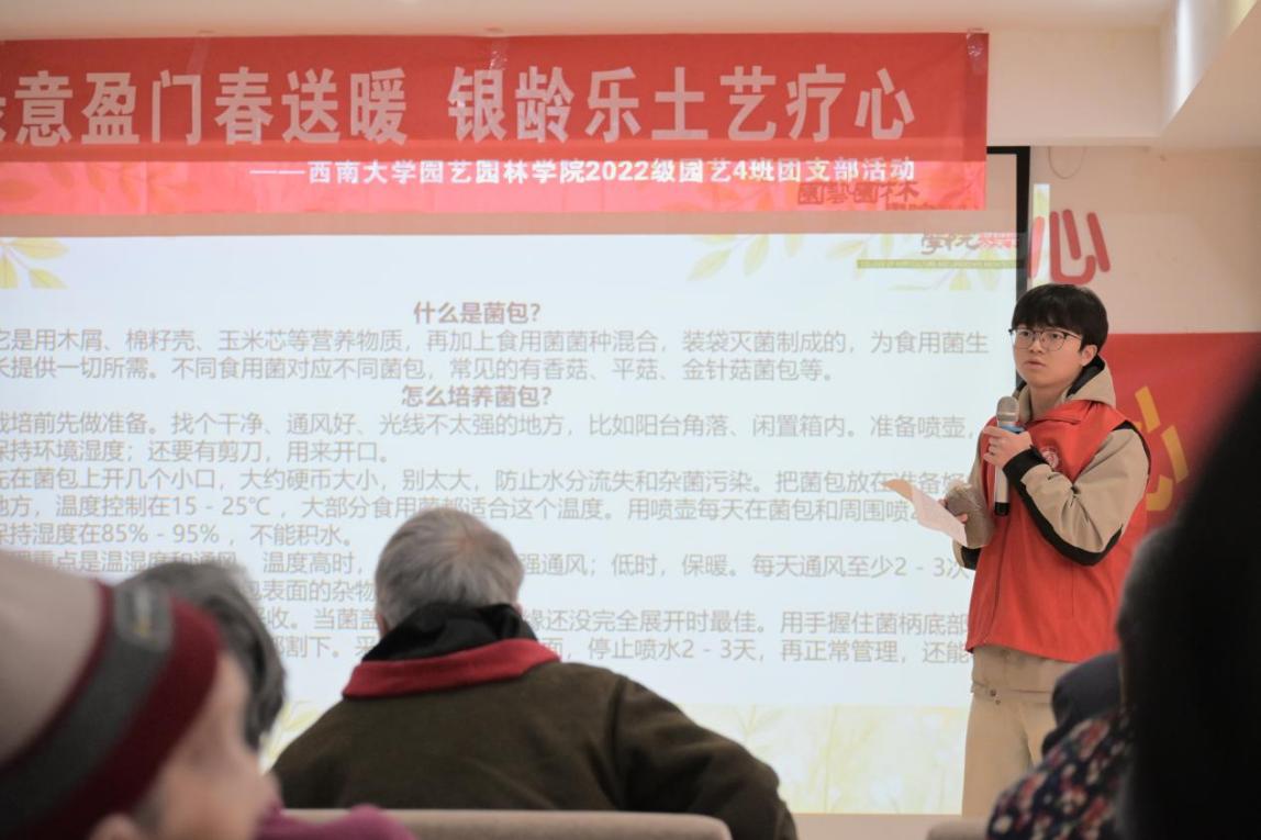 2022级园艺4班团支部携手重庆市北碚区朝阳街道养老服务中心、北碚区碚城义工协会,精心策划开展了“绿意盈门春送暖,银龄乐土艺疗心”主题团日活动,以专业特色为依托,为老人们送去春日里的温暖与快乐。