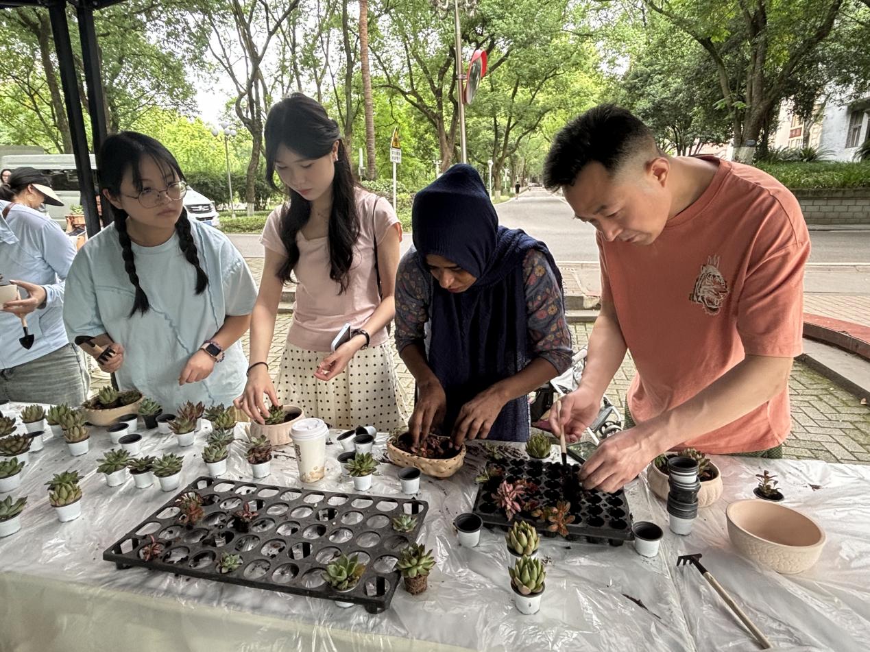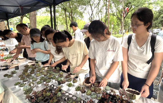 活动现场提供绿植、造景装饰、营养土、铺面石、精美花盆等微景观设计材料,随着参与者陆续到来,现场逐渐升腾起盎然生机。参与者穿梭于琳琅满目的材料间,选取了自己心仪的花盆,亲手将土壤置于盆器中,移栽绿植、搭配精巧的景观摆件,一步步制作出一盆盆精美的盆栽。随后,参与者结合植物特质与个人性格特点,在现场写下“绿植心语”养护宣言和心愿寄语。