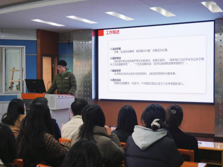 组织部负责人李俊杰从八个维度对近期工作进行系统阐述,同时明确了下一阶段重点安排,包括聚焦发展新团员、定期开展专题培训、实施团支部考核打分等任务,持续完善团组织建设、深化团员思想教育工作。