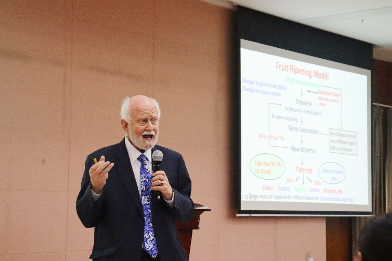 院士、英国诺丁汉大学植物科学系名誉教授、中国工程院外籍院士、浙江大学光彪教授、国际知名果实品质生物学专家Dr.Don Grierson,于隆平楼204开展了以The Regulatory Networks Controlling Composition and Quality of Ripening Fruits为主题的学术报告,约200位师生参与本次讲座。